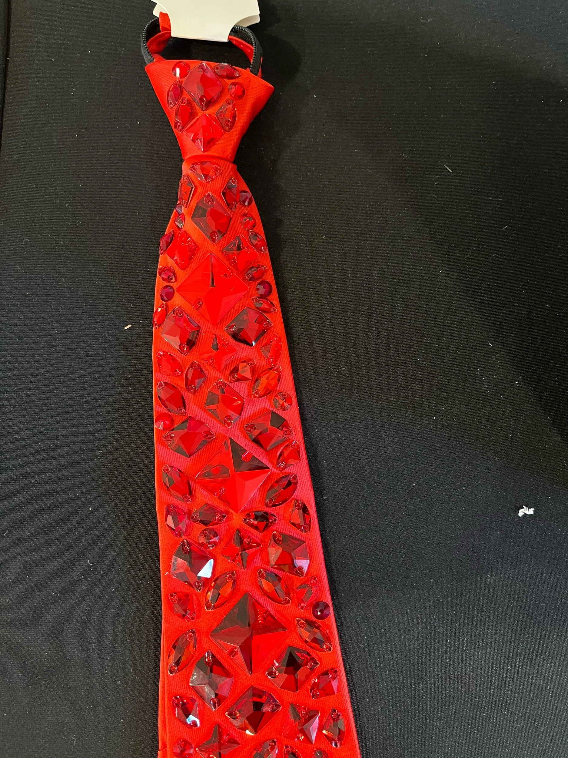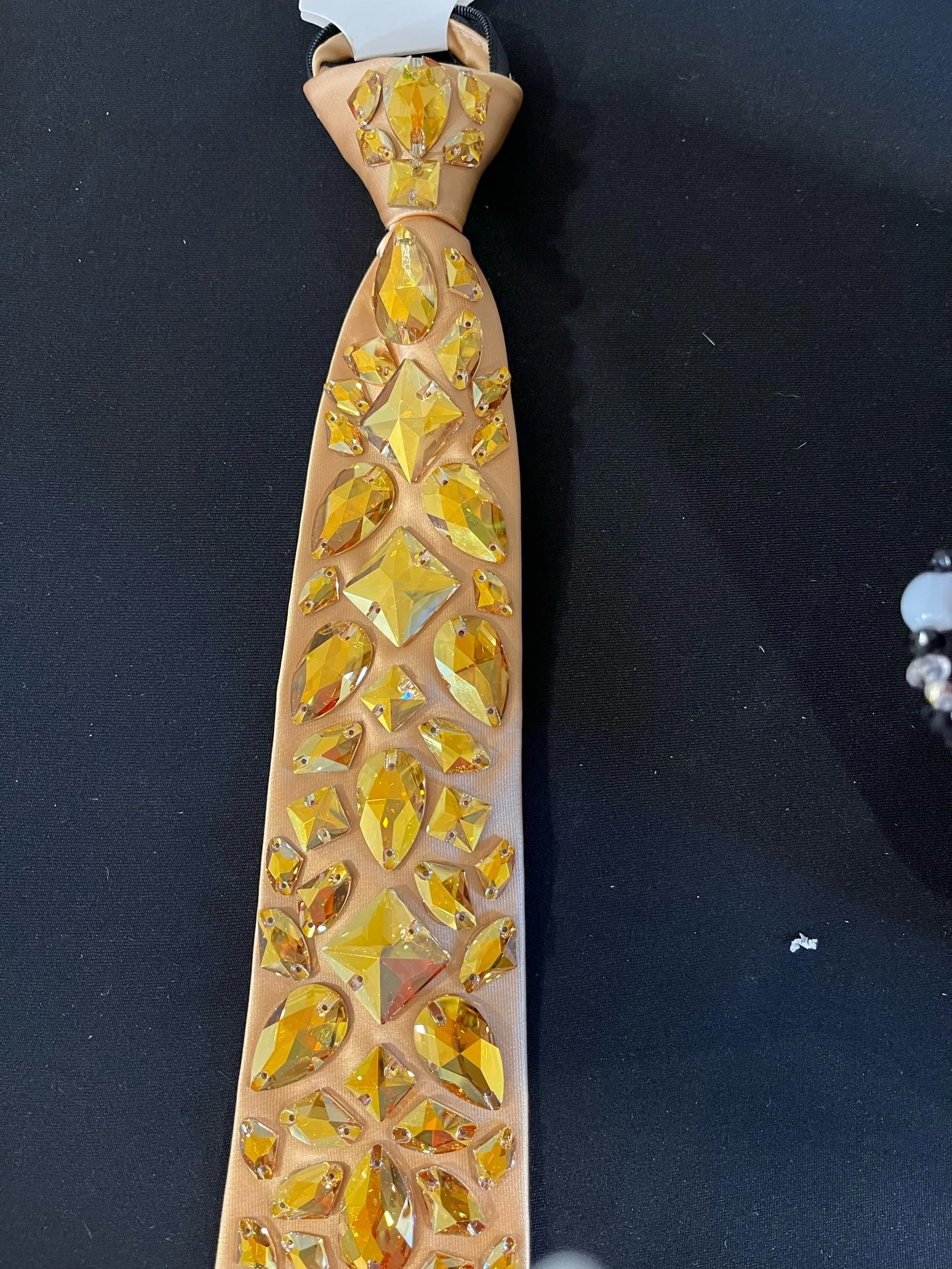 Boys 15” competition blinged out tie custom adorned with Australian crystals to help accentuate the shine on stage with a competition vest or jacket. Any tie option can be customized to match each dancer’s costume.